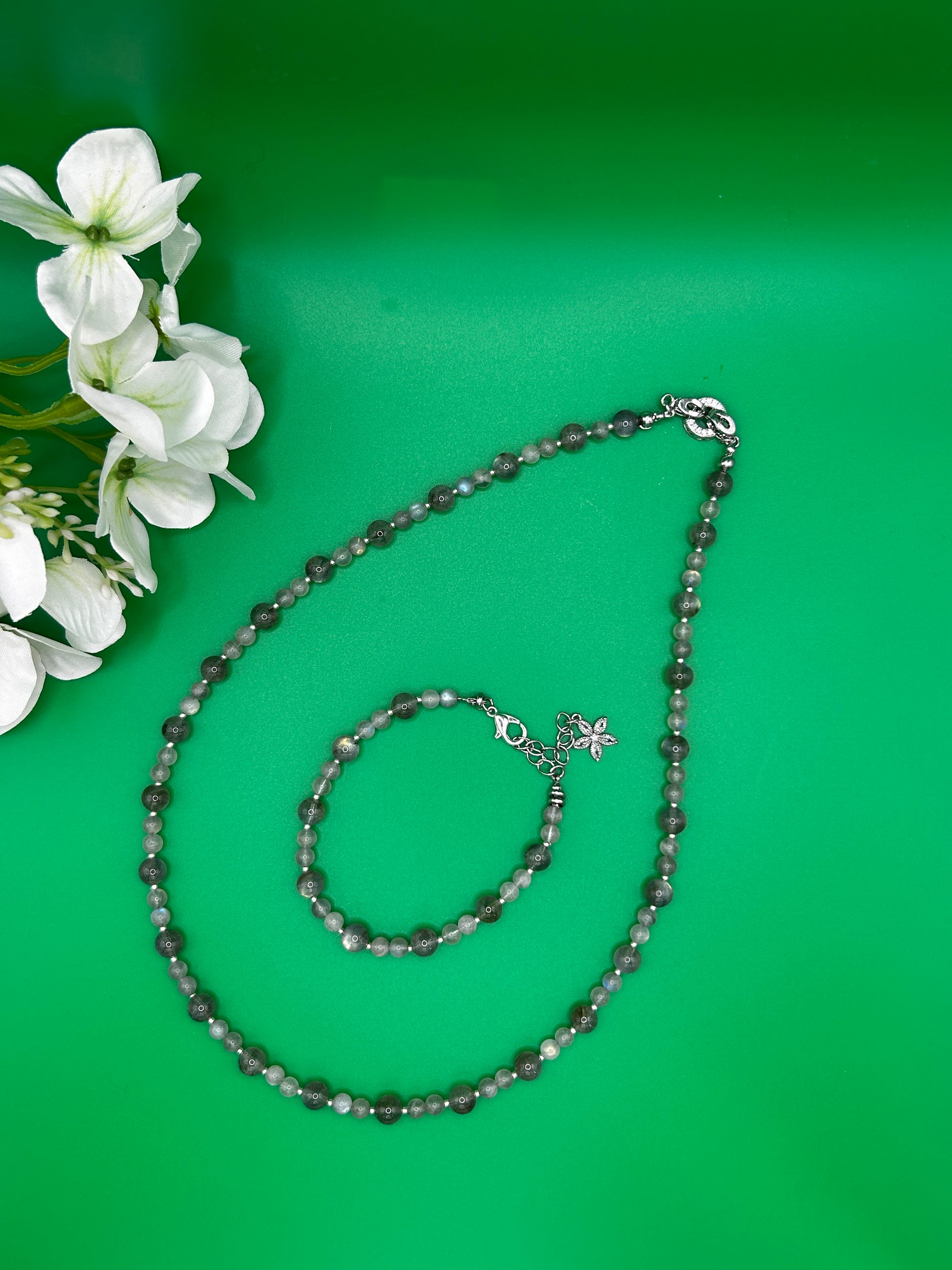 The Ivy Set brings the luminous beauty of labradorite into a refined two-piece ensemble. With its natural shimmer and elegant tones, this matching necklace and bracelet are perfect for both everyday sophistication and special occasions.