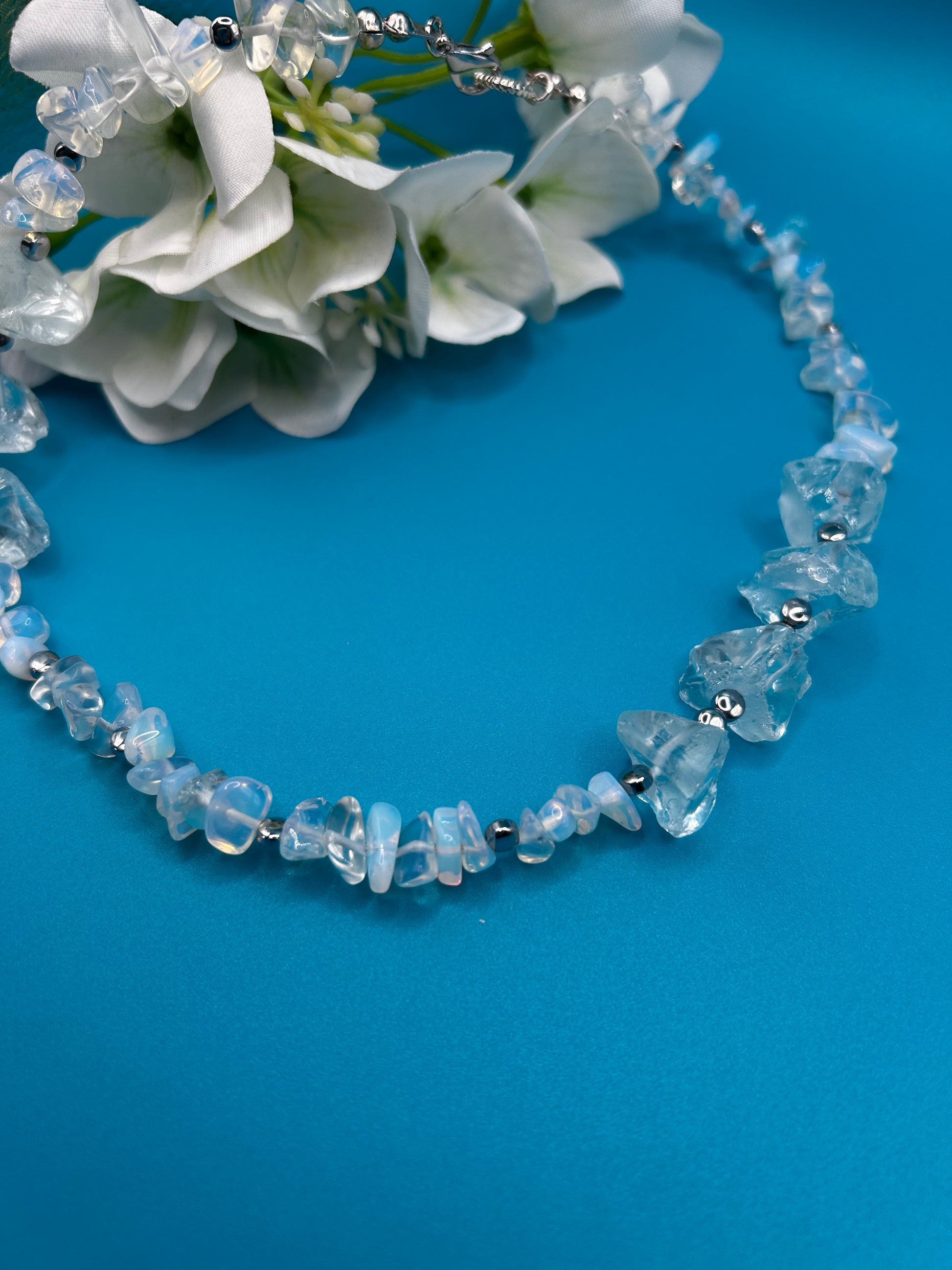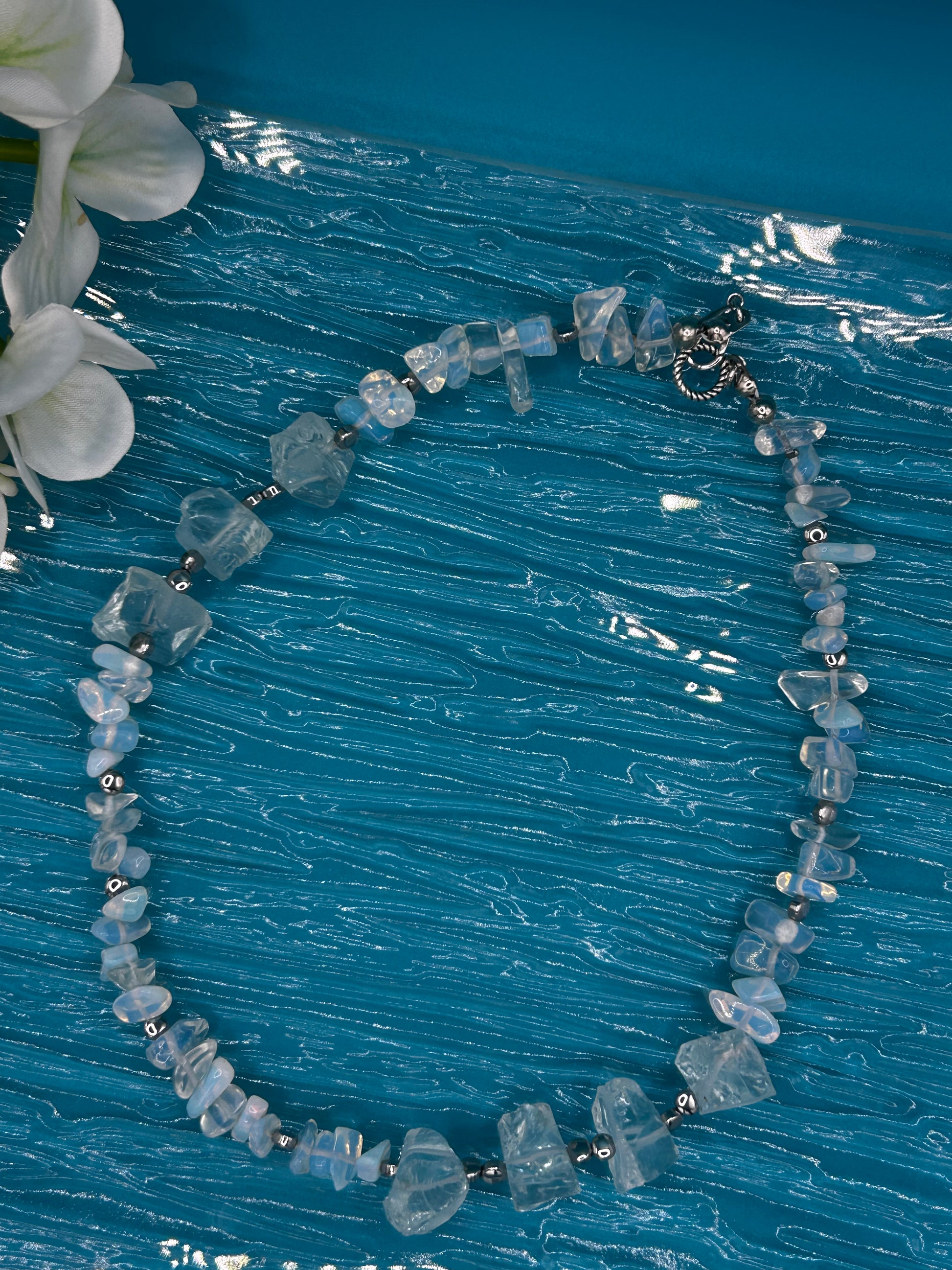 Collar Tsuki: Piedra lunar, hematita plateada y aguamarina natural