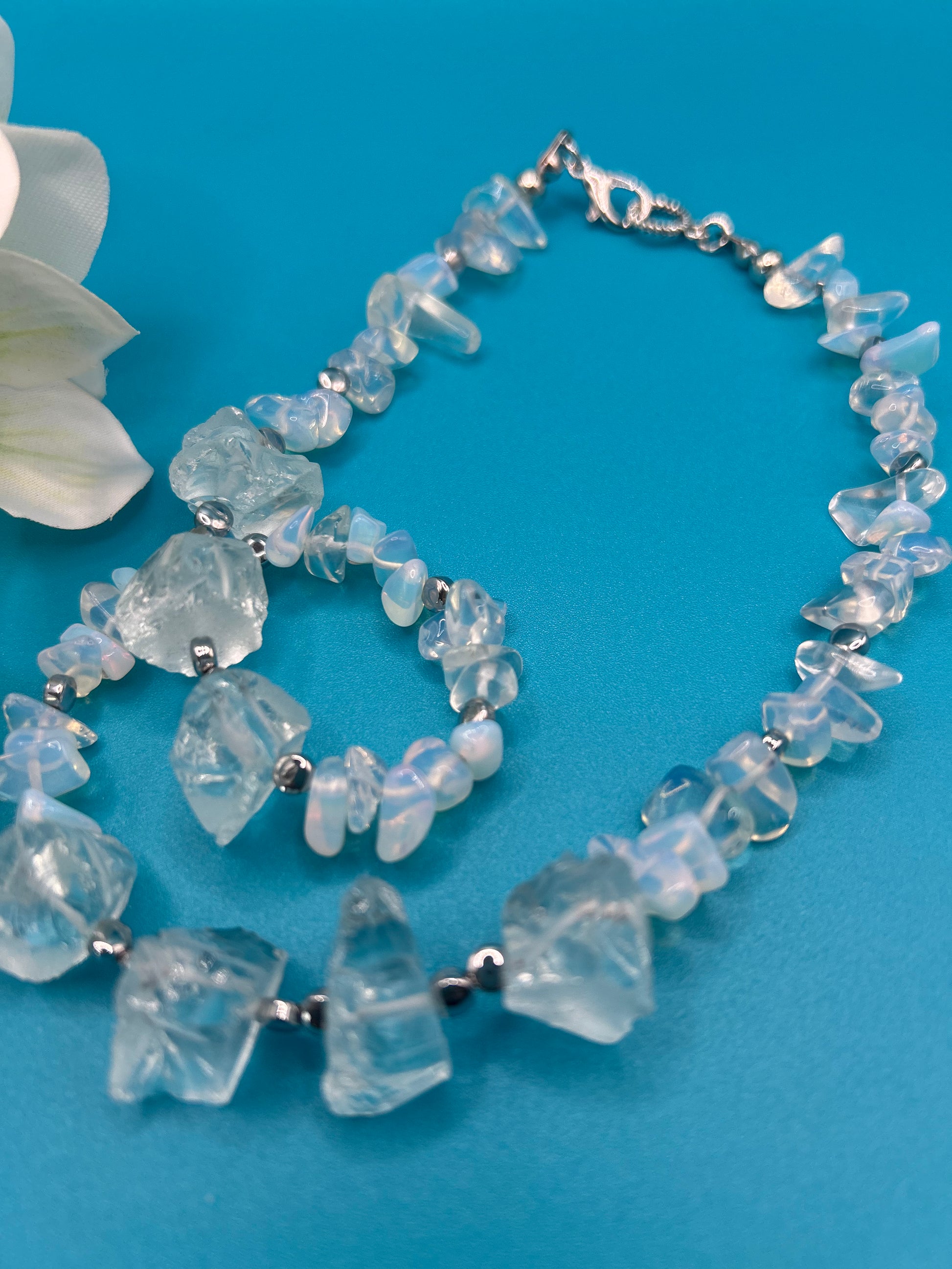 Materiales : Piedra lunar, hematita plateada, aguamarina natural.